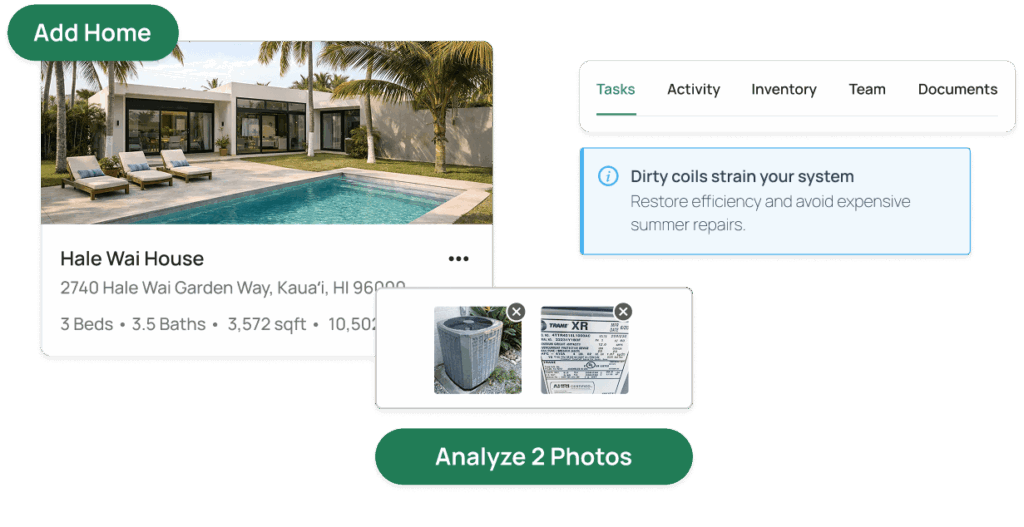Upload photos and let VillaFact pull models, manuals, and maintenance needs automatically.